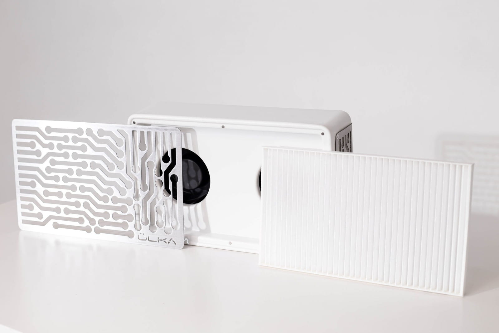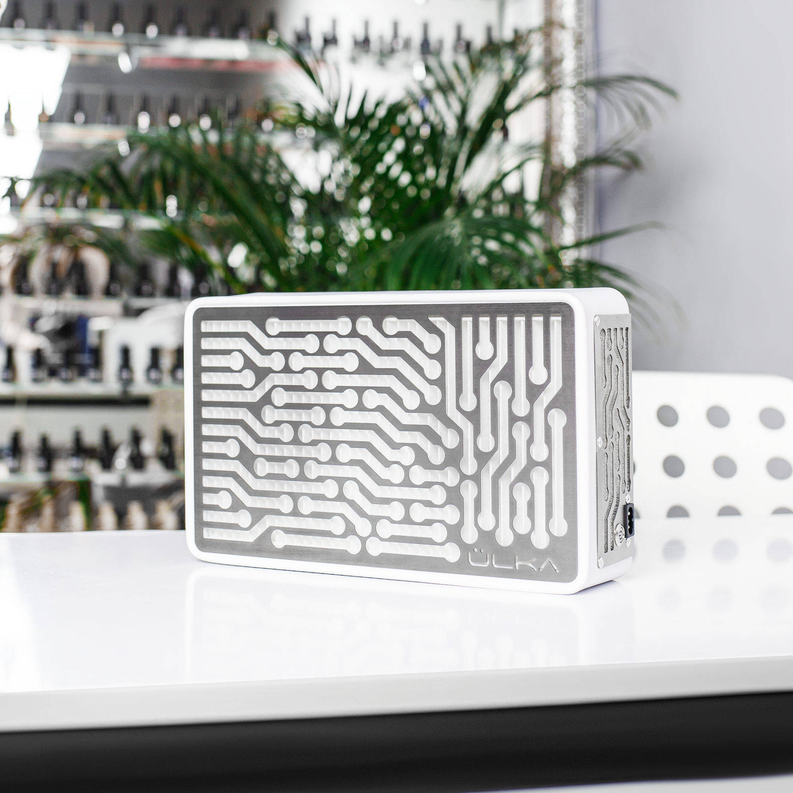 Profesjonalny pochłaniacz pyłu ÜLKA Nano – biały, cichy, lekki i wydajny. Idealny do manicure w domu i salonie. Filtr wielokrotnego użytku, moc 58 W.