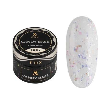 - Baza żelowa F.O.X Candy Base 006 biel z brokatem, wzmacnia paznokcie, łatwa aplikacja, bez formaldehydu, idealna do stylizacji hybrydowej.